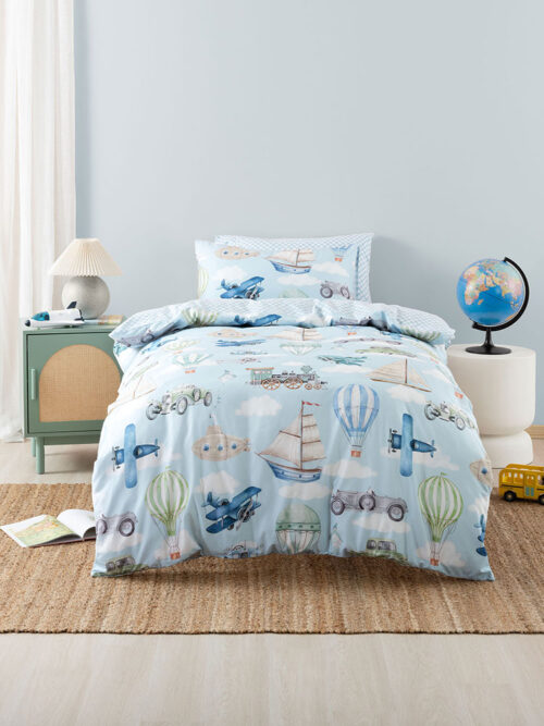 This action packed design features race cars in bold primary colours, zipping around a winding track on a grey 100% cotton base, bringing all the thrills of the race track straight to their bedroom. This thrilling design reverses to a blue check print.