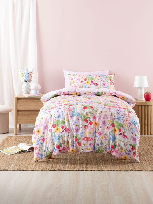 Say hello to bedtime magic! Strawberry Meadow is bursting with fairytale fun, featuring a garden bursting full of cheerful flowers, spotty red toadstools, fluttering fairies and juicy strawberries scattered across a dreamy pink base. This snuggly design is printed on 100% cotton, reversing to a hand-painted stripe.