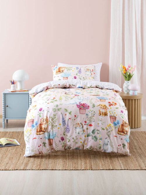 Get ready for a hop, purr and a cuddle! Dreams are sweeter with Woodland Whiskers, a cosy world where fluffy bunnies and curious kittens peek out from blooming flowers, set against a blushing pink base. Printed on 100% cotton, this wonderland reverses to a sweet lilac heart print.