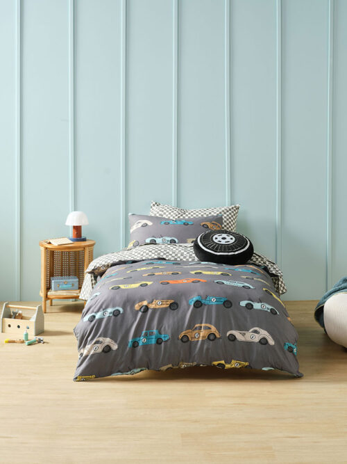 Ready, set, go! Featuring race cars of all shapes and sizes, this range is printed on grey cotton ground. Complete with a playful grey and white checked reverse and knife edge finish.
