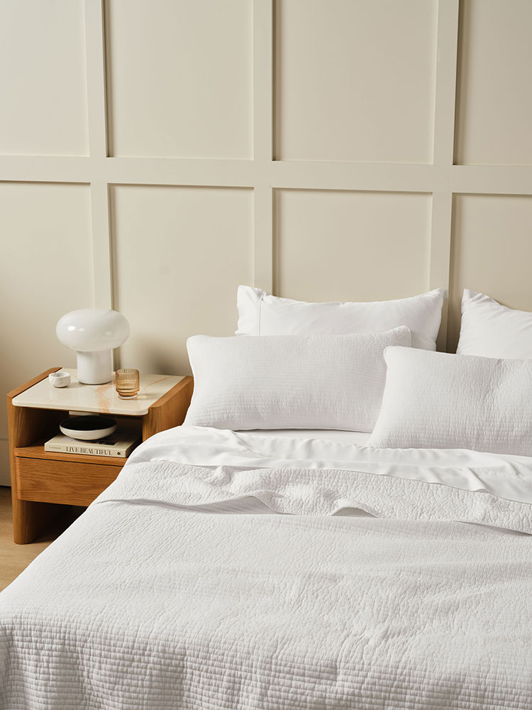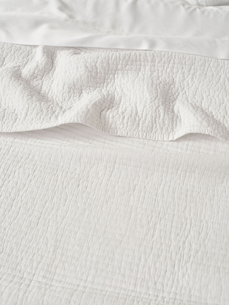 Quilted coverlet set in a simple modern linear stitched pattern available in grey, oatmeal or white.
