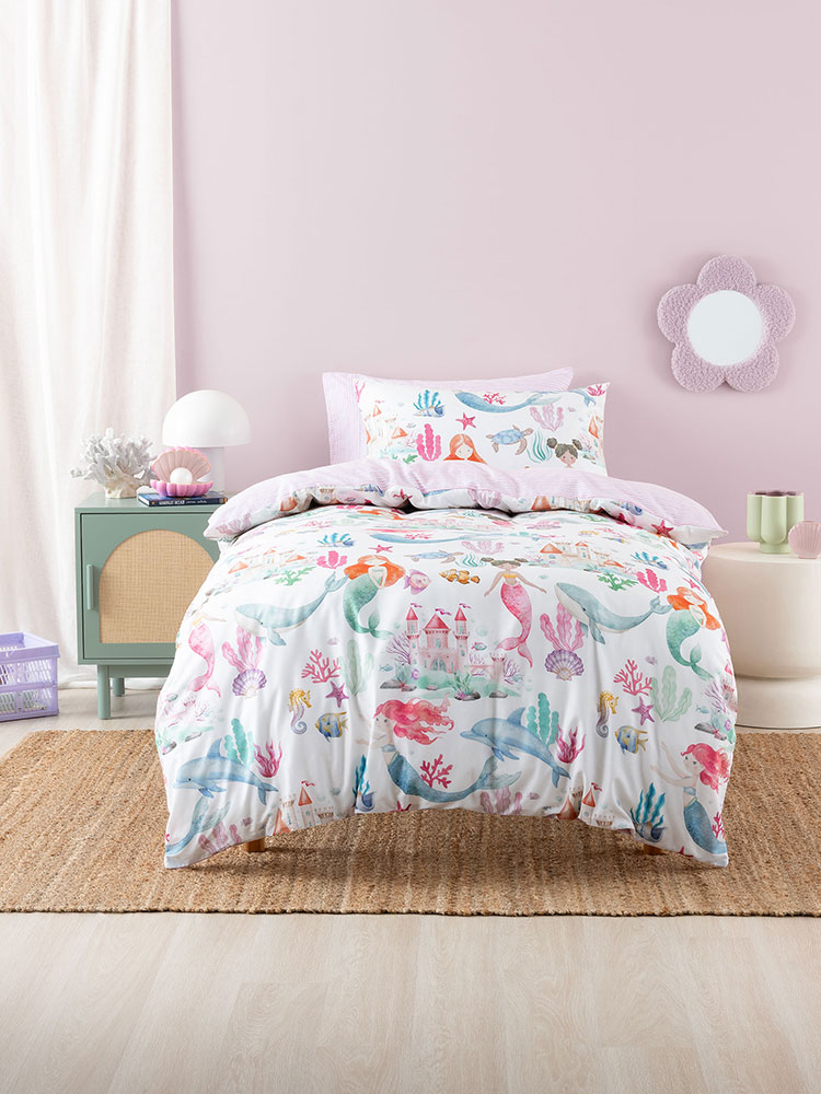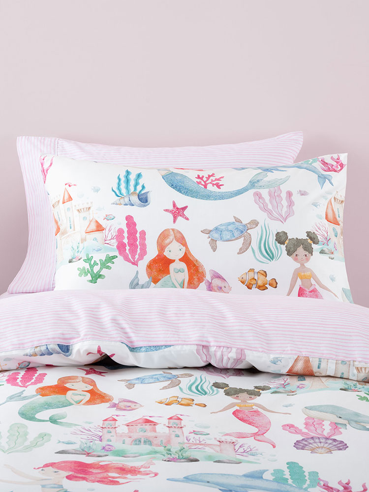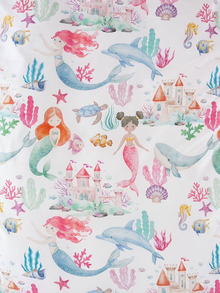 Dive into dreamland with Mermaid Splash! The enchanting underwater scene features a vibrant world of colourful mermaids, friendly dolphins, majestic whales and more. From shimmering seashells to coral castles, this magical seascape is printed on 100% cotton, reversing to a hand-painted stripe.