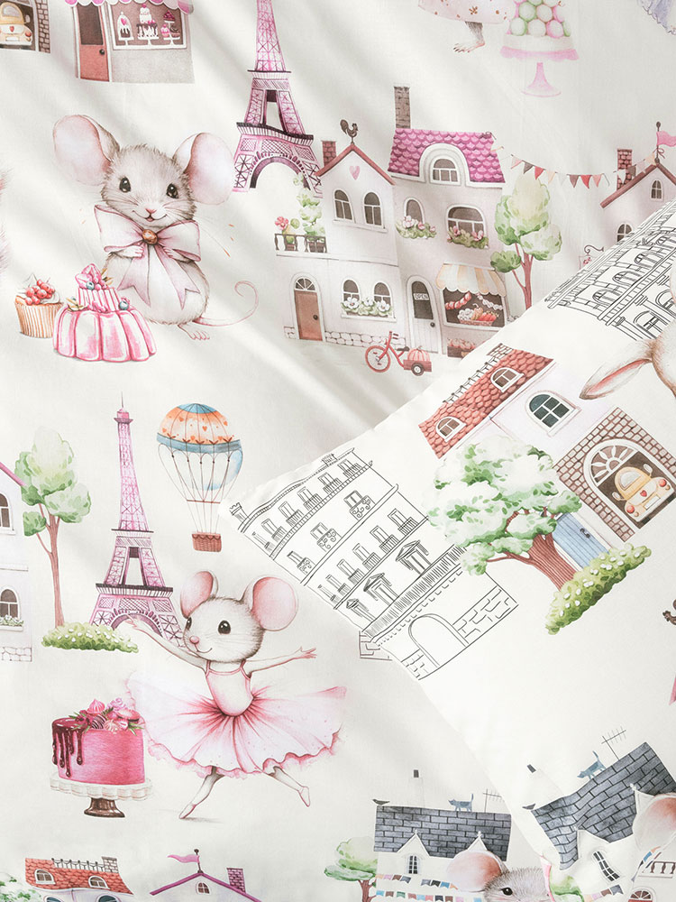 Say bonjour to Paris Tails! Sweet little bunnies, mice and squirrels explore the magic of Paris in style. From fancy dresses and French bakeries to the twinkling Eiffel Tower, this adorable duvet cover is brimming with storybook charm. The dreamy Parisian streetscape sits on an off-white 100% cotton base and reverses to a blushing pink check print.