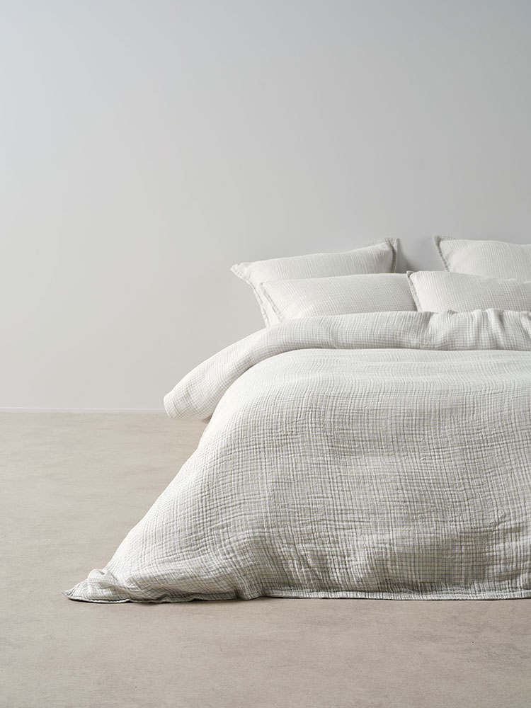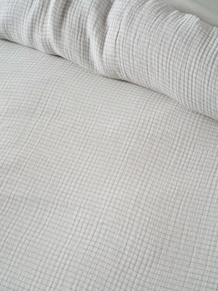 Rohan’s crinkled cotton voile is a heavenly soft, textured beauty. Intriguing in design, this check weaves off white with hydrangea-blue, creating a timeless, yet entirely new aesthetic for your bedroom. Complete with elegantly tailored edges, Rohan begs to be adorned with matching cushions and throws.