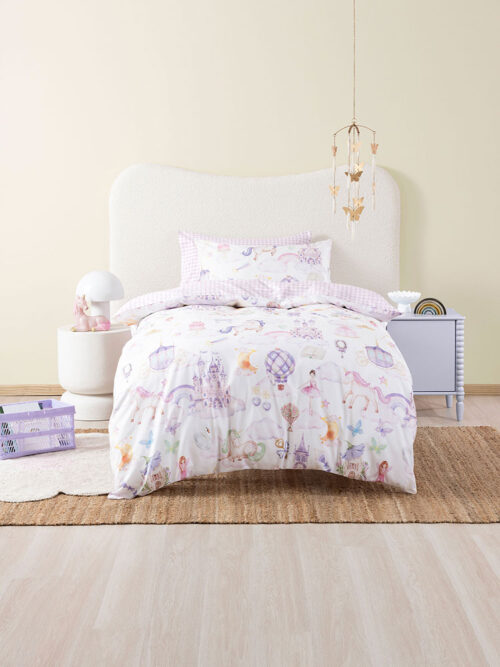 The sun sets over the hill, but these machines won’t stop now – they’ve got to get harvest off before rain hits! Inspired by the designer’s real-life home on a farm, this enchanting, farm scene is printed on 250 thread, organic cotton percale, and comprises windmills, shearing sheds and rolling hills that sit peacefully amongst sheep, cows, chickens, and alpacas. It reverses to a simple, hand-drawn stripe, and is trimmed with cord piping.